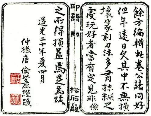 《松石齋印譜》是清道光二十年(1840),唐璉仲孫唐儉(以廉)搜集編輯而成的。在唐儉的《<松石齋印譜>后跋》中云:“家祖介亭公以書畫著名,故刻有《證道錄》《書畫瑣言》、《信手拈來》三冊,而于篆刻一道尤精焉。儉有志斯道,而才學(xué)谫陋,雖日侍左右,僅學(xué)書畫一端而于篆刻究未嘗不愛焉。是以家祖夢游后,嘗檢手澤,有留藏《松石齋印譜》二卷,共計數(shù)百余方,俱系家祖親手所刻。噫,家祖之用心良苦矣哉。雖然家祖之生平所篆刻此外尚夥,或寄之遠(yuǎn)方,或隱于僻地。道光已亥,儉復(fù)搜輯各處,又得數(shù)百余方。編輯此卷,公諸同好,但年遠(yuǎn)日久,其中不無損壞,篆刻刀法多有模糊之處,玩好者當(dāng)有定見,非儉之所得損益焉。是為跋。一是跋寫于唐璉逝世四年后的道光二十年夏四月,現(xiàn)我們從跋文中可得知: