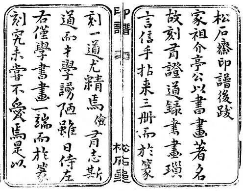 《松石齋印譜》,開本高25.6公分,寬15.4公分,粉連紙木雕板雙線墨框,板框高20.5公分、寬11.8公分。書口上方刻隸書體“印譜”兩字,下刻有“松石齋”書名。卷首有乾隆甲辰年龔潤撰《<松石齋印譜>題辭》(題后有“臣潤私印”、“褆齋”款印二方,與正文同系木板雕刻印刷),卷末為唐璉之仲孫唐儉(以廉)的《<松石齋印譜>后跋》(正文系木板雕刻印刷,題跋后有“唐儉”、“??谑稀笨钣《剑翟♀徤w)。印譜正文均以原印用朱砂印泥鈐蓋本,計19頁(見圖1)。