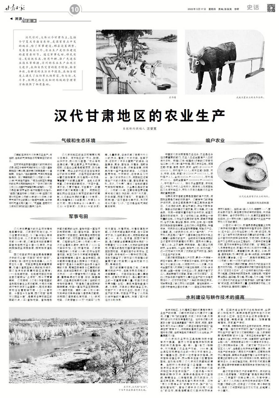漢代涼州,大體以今甘肅為主,包括今寧夏及青海省東部,是國家重點(diǎn)開發(fā)的地區(qū),除了軍事建設(shè)、郡縣設(shè)置調(diào)整、發(fā)展畜牧業(yè)以外,農(nóng)業(yè)生產(chǎn)是經(jīng)濟(jì)建設(shè)的最重要環(huán)節(jié)。通過軍事屯田、移民實(shí)邊、發(fā)放鐵農(nóng)具、使用牛耕、推廣先進(jìn)農(nóng)業(yè)技術(shù)等舉措,涼州的農(nóng)業(yè)生產(chǎn)出現(xiàn)巨大進(jìn)步,抗御自然災(zāi)害的能力增強(qiáng),糧食豐收,自耕農(nóng)的生活水平提高,在相當(dāng)程度上滿足了駐防軍隊(duì)的軍需,為與匈、羌斗爭、絲綢之路交流和對(duì)西域的管理等方面提供了物質(zhì)基礎(chǔ)。