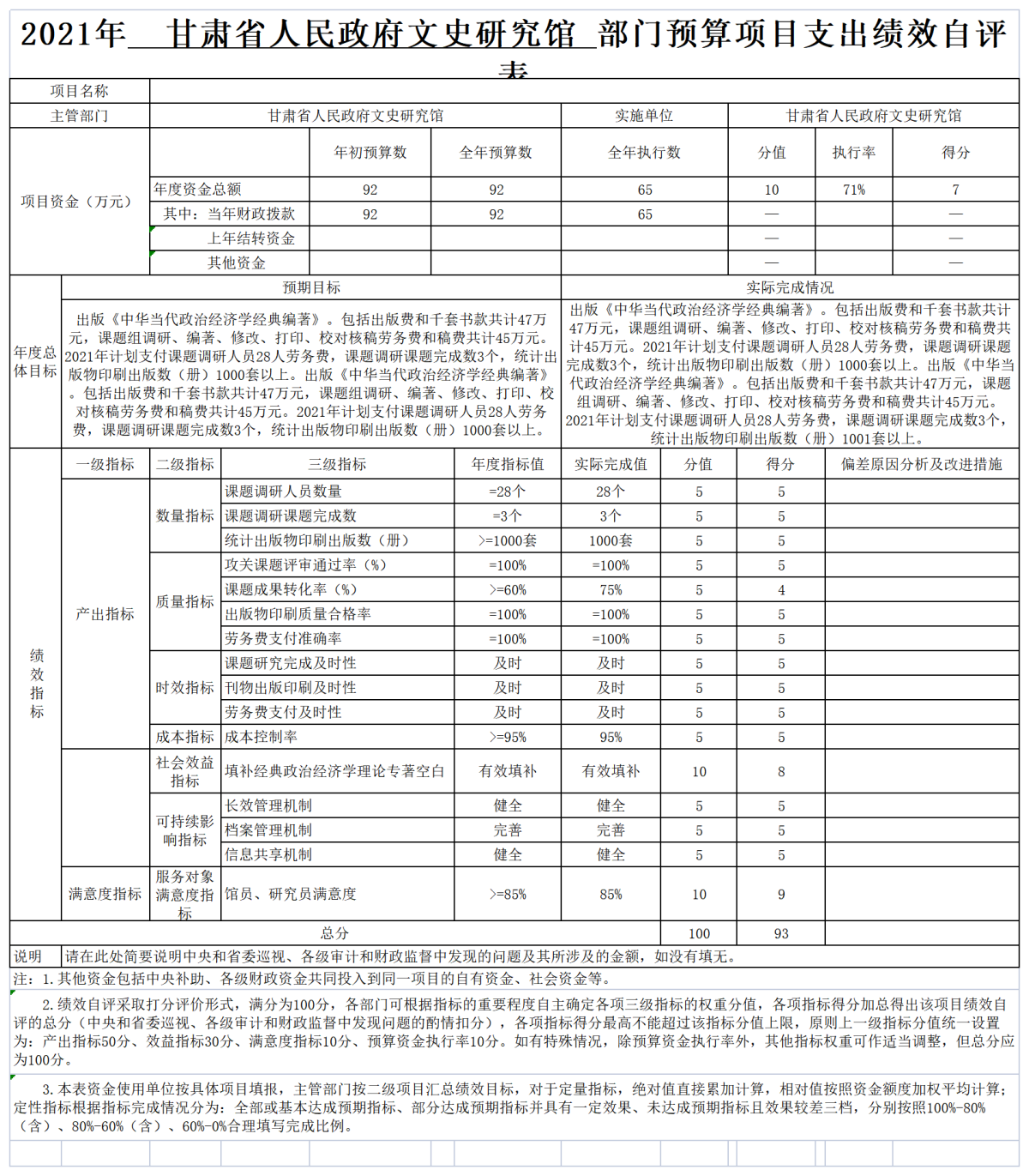 《政治經(jīng)濟(jì)學(xué)經(jīng)典新編》課題經(jīng)費(fèi)自評綜述:根據(jù)年初設(shè)定的績效目標(biāo),項(xiàng)目績效自評得分為93分,項(xiàng)目全年預(yù)算數(shù)為 92萬元,執(zhí)行數(shù)為65萬元,完成預(yù)算的71%。
