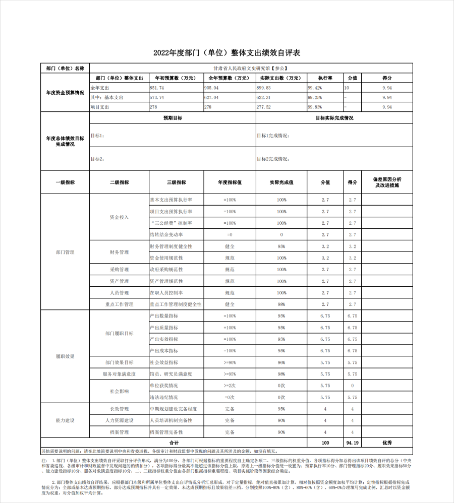 業(yè)務費項目績效自評情況:2022年度根據(jù)文史研究館職責,省財政安排專項業(yè)務費,保障機關(guān)運行,完成以文史考察、文化調(diào)研、書畫采風創(chuàng)作展覽、建言獻策、文化交流、海外聯(lián)誼、《甘肅文史》編輯印刷發(fā)行。發(fā)放館員、研究員工作津貼等方面基本達到預期績效目標。