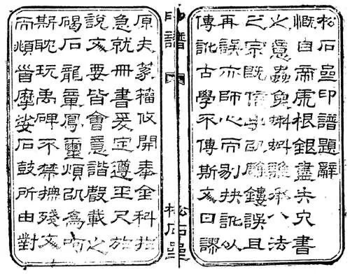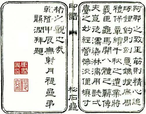 《松石齋印譜》,開本高25.6公分,寬15.4公分,粉連紙木雕板雙線墨框,板框高20.5公分、寬11.8公分。書口上方刻隸書體“印譜”兩字,下刻有“松石齋”書名。卷首有乾隆甲辰年龔潤撰《<松石齋印譜>題辭》(題后有“臣潤私印”、“褆齋”款印二方,與正文同系木板雕刻印刷),卷末為唐璉之仲孫唐儉(以廉)的《<松石齋印譜>后跋》(正文系木板雕刻印刷,題跋后有“唐儉”、“??谑稀笨钣《剑翟♀徤w)。印譜正文均以原印用朱砂印泥鈐蓋本,計19頁(見圖1)。