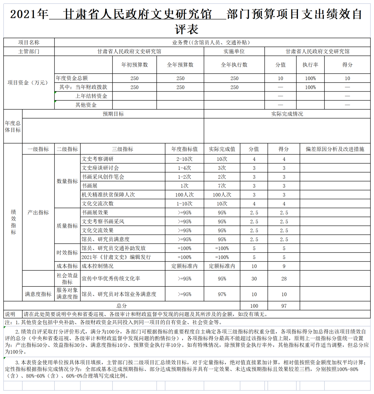 業(yè)務(wù)費(fèi)項(xiàng)目績效自評綜述:根據(jù)年初設(shè)定的績效目標(biāo),項(xiàng)目績效自評得分為97分。項(xiàng)目全年預(yù)算數(shù)為 250 萬元,執(zhí)行數(shù)為 250萬元,完成預(yù)算的100%。