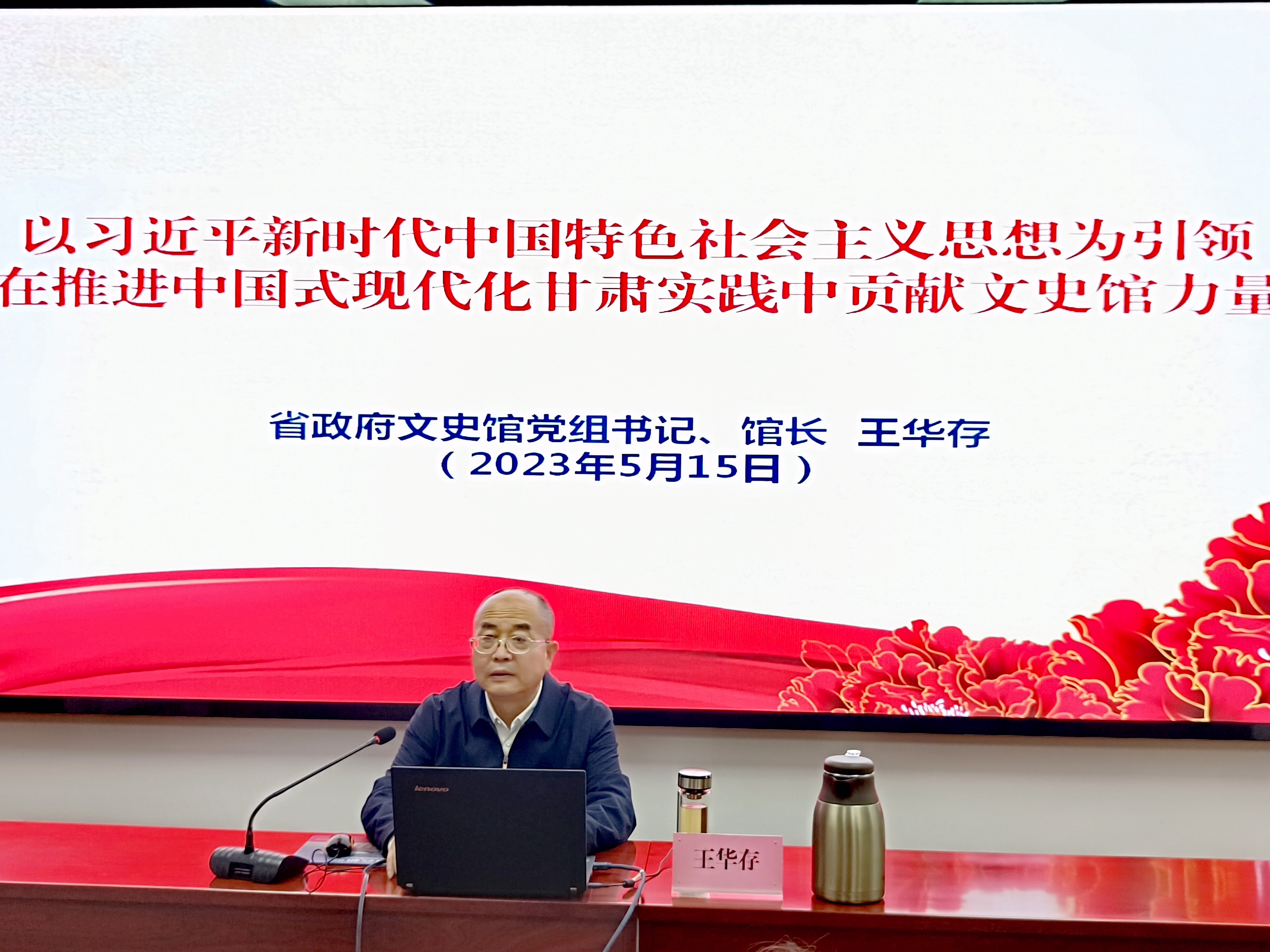 5月15日,省政府文史研究館黨組書記,館長(zhǎng)王華存緊緊圍繞學(xué)習(xí)貫徹習(xí)近平新時(shí)代中國(guó)特色社會(huì)主義思想,作題為《以習(xí)近平新時(shí)代中國(guó)特色社會(huì)主義思想為引領(lǐng),在推進(jìn)中國(guó)式現(xiàn)代化甘肅實(shí)踐中貢獻(xiàn)文史館力量》專題黨課。省委第七巡回指導(dǎo)組組長(zhǎng)馬世林、副組長(zhǎng)牟錄貴,省政府文史研究館副館長(zhǎng)楊貴言及館黨組成員、機(jī)關(guān)黨委專職副書記王曉琴出席,省委第七巡回指導(dǎo)組成員及文史館全體黨員干部參加。