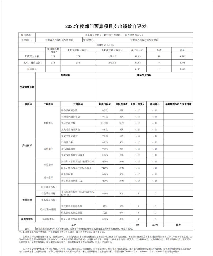 業(yè)務費項目績效自評情況:2022年度根據(jù)文史研究館職責,省財政安排專項業(yè)務費,保障機關(guān)運行,完成以文史考察、文化調(diào)研、書畫采風創(chuàng)作展覽、建言獻策、文化交流、海外聯(lián)誼、《甘肅文史》編輯印刷發(fā)行。發(fā)放館員、研究員工作津貼等方面基本達到預期績效目標。